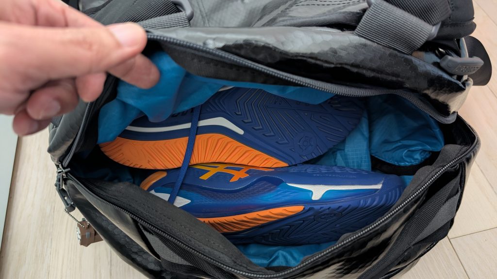 - バッグに余裕がある: ラケット2本、シューズ1足、着替え、水筒などを入れてもバッグ内に空間が残ります。この余白のおかげで、バッグがパンパンにならず、担いだ状態では見た目ほど大きく感じません。