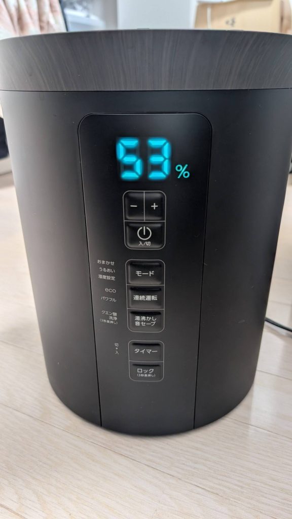 - 加湿パワー: 設定を45%など控えめにしておかないと、部屋が結露してしまうほどのパワーがあります。すぐに部屋の湿度を上げたい時や、広い部屋でも安心です。