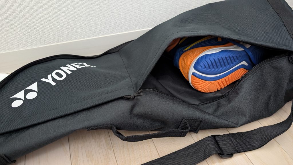 多くのラケットバッグが手持ちかリュックタイプなのに対し、このバッグは斜めがけできるのが大きな特徴です。